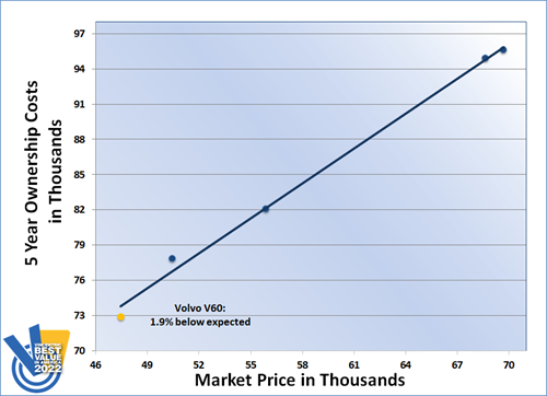 The Volvo V60 earned the 2022 Vincentric Best Value in America™ award in the Luxury Wagon segment. The V60 delivered a best-in-class performance with the lowest depreciation, insurance, operating, repair, and total ownership costs in its class.