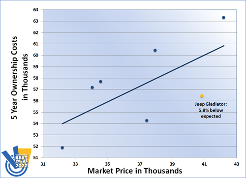 The Jeep Gladiator won the 2022 Vincentric Best Value in America™ award in the Small/Mid-Size Pickup segment. The Gladiator rose to the top and outperformed 6 competitor models, due in no small part to having ownership costs that were over 5% lower than expected.