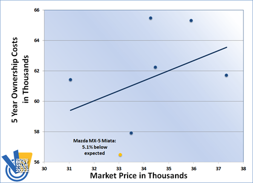 For the fourth consecutive year, the Mazda MX-5 Miata came out on top of the Sports Car segment of the Vincentric Best Value in America™ awards. Having the lowest fuel, insurance, operating, and total ownership costs in its class for 2022 contributed to the MX-5 Miata’s award-winning performance.