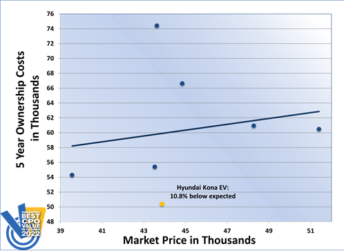 For the second consecutive year, the Hyundai Kona EV came out on top of the EV/PHEV SUV segment of the Vincentric Best CPO Value in Canada™ awards. Having the lowest maintenance, fuel, and total ownership costs in its class helped the Kona EV reclaim the top spot on the podium for 2022.