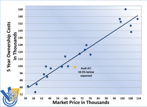 The Audi A7 took home the 2022 Vincentric Best CPO Value in Canada™ award in the Luxury Large Sedan segment, making this the second time that the A7 has achieved this award. Having the lowest maintenance cost in its class was a key factor in the A7's victory.