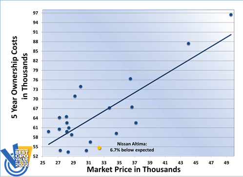 The 2022 Vincentric Best CPO Value in Canada Awards are based on the average of all trim levels for each model from the 2017-2021 model years. Costs are based on 5 years of ownership with annual mileage of 20,000 kilometers. Graph shown is a visual representation of the actual results, but may not reflect the exact calculations. To learn more about this graph and how Vincentric measures value, click here.