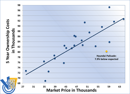The Hyundai Palisade delivered strong results to claim the 2022 Vincentric Best CPO Value in Canada™ award in the Mid-Size SUV segment, outperforming an outstanding 22 competitor models.