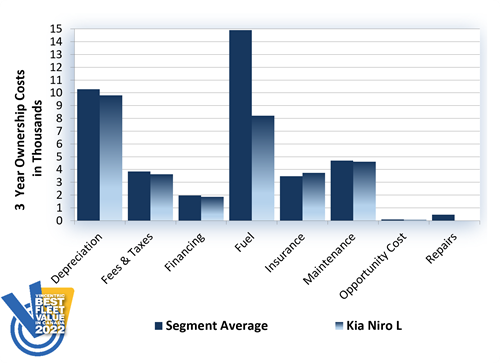 The Subcompact SUV segment of the 2022 Vincentric Best Fleet Value in Canada™ awards was claimed by the Kia Niro L. Having the lowest operating and fuel costs in its class helped the Niro L take home the victory.