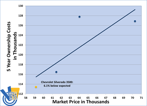 The Chevrolet Silverado 3500 was honoured with the Vincentric Best Value in Canada™ award in the Full-Size 1-Ton Pickup segment, making 2022 the second time that it has won this award. Having the best fuel economy in its class along with the lowest depreciation, insurance, repair, and total ownership costs in its class were key factors in the Silverado 3500's triumphant performance.