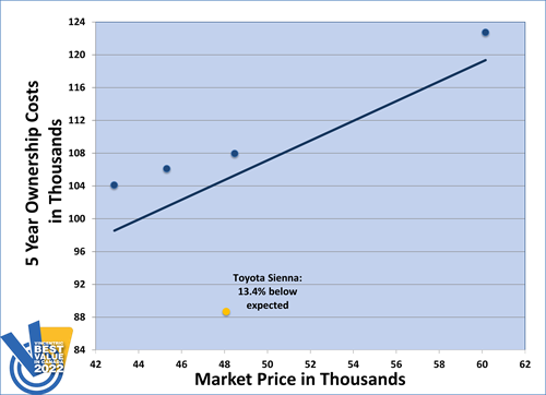 The Toyota Sienna returned as the winner of the Minivan segment of the Vincentric Best Value in Canada™ awards, making 2022 the fourth consecutive and fifth time overall that the Sienna has conquered this segment. The Sienna impressed this year by having the lowest depreciation cost, operating costs, total ownership costs, and the best fuel economy of all Minivans.