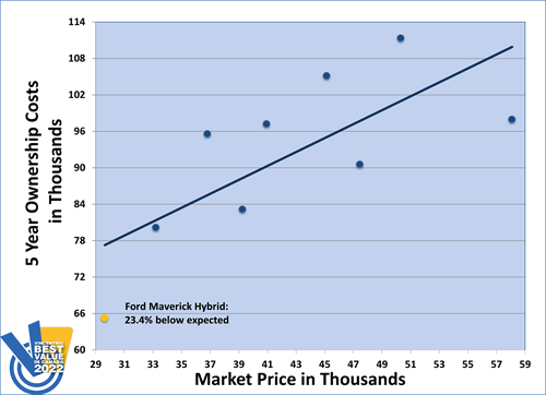 The Ford Maverick Hybrid won the 2022 Vincentric Best Value in Canada™ award in the Small/Mid-Size Pickup segment, due in no small part to having the lowest fuel, maintenance, operating, and total ownership costs in its class.