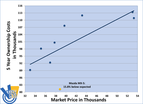 Returning for an outstanding seventh year in a row, the Mazda MX-5 maintained its winning streak in the Sports Car segment of the Vincentric Best Value in Canada™ awards. The MX-5 impressed for 2022 by having the best fuel economy, lowest insurance cost, lowest operating costs, and lowest overall ownership costs in its class.